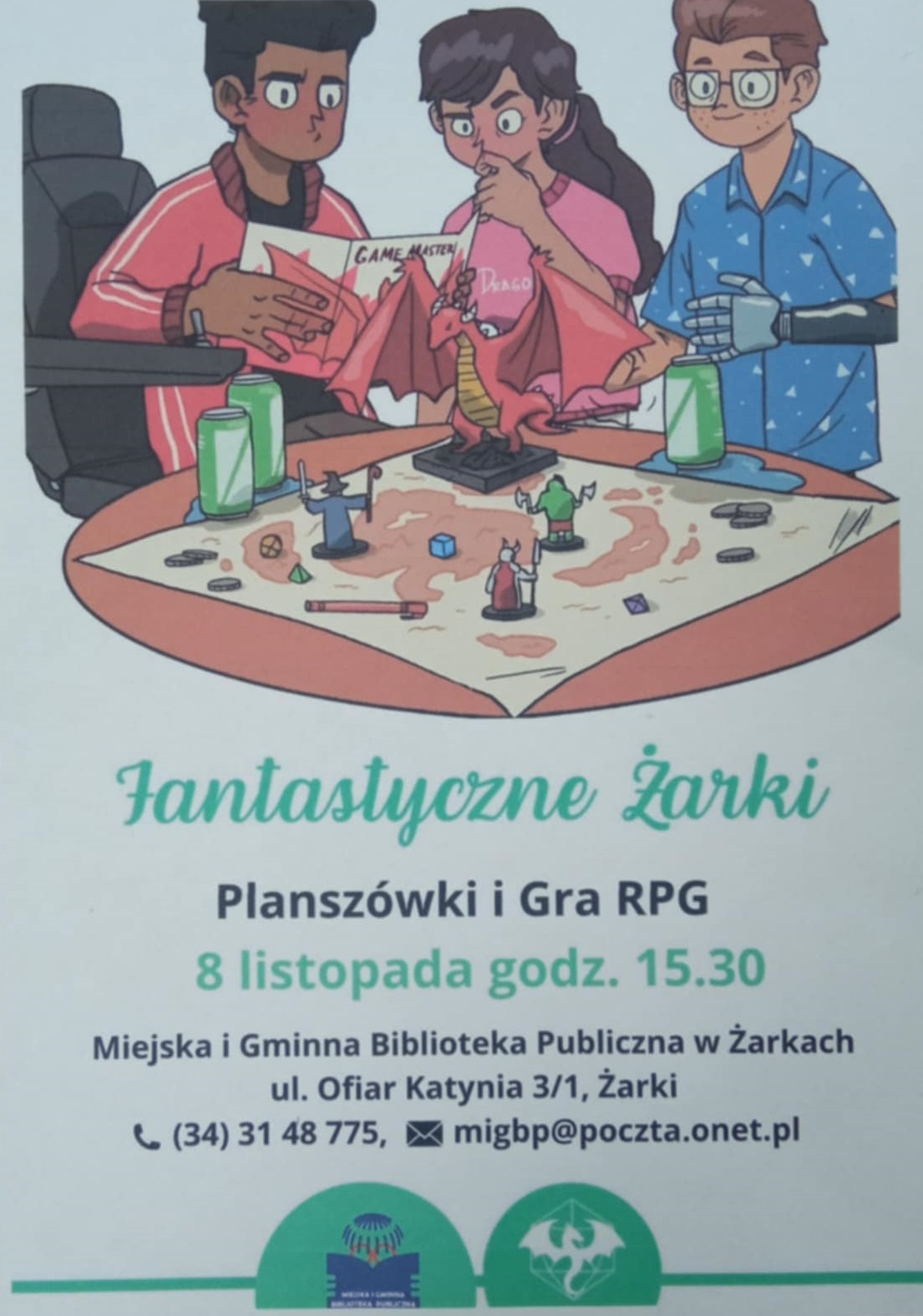 W ramach współpracy naszej biblioteki szkolnej z Miejską i Gminną Biblioteką Publiczną w Żarkach serdecznie zapraszamy wszystkich chętnych do udziału w planszówkach i grach RPG. Start 8 listopada o godzinie 15:30, Miejska i Gminna Biblioteka…